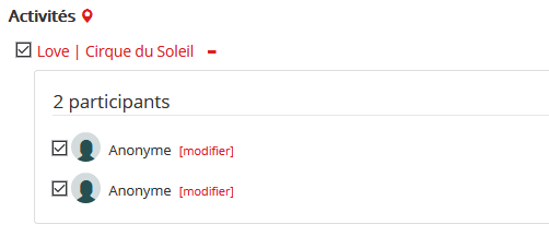 Lorsqu’une activité est sélectionnée, vous verrez un icône rouge “+” s’afficher à droite du nom de l’activité. Si vous cliquez sur l’icône, vous pourrez visualiser les participants et vous pourrez, si nécessaire, désélectionner les voyageurs qui ne voudraient pas participer à l’activité. Évidemment, le prix s'ajustera en conséquence.