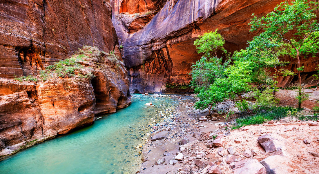 Turquoise water at the bottom of the canyon in Zion National Park